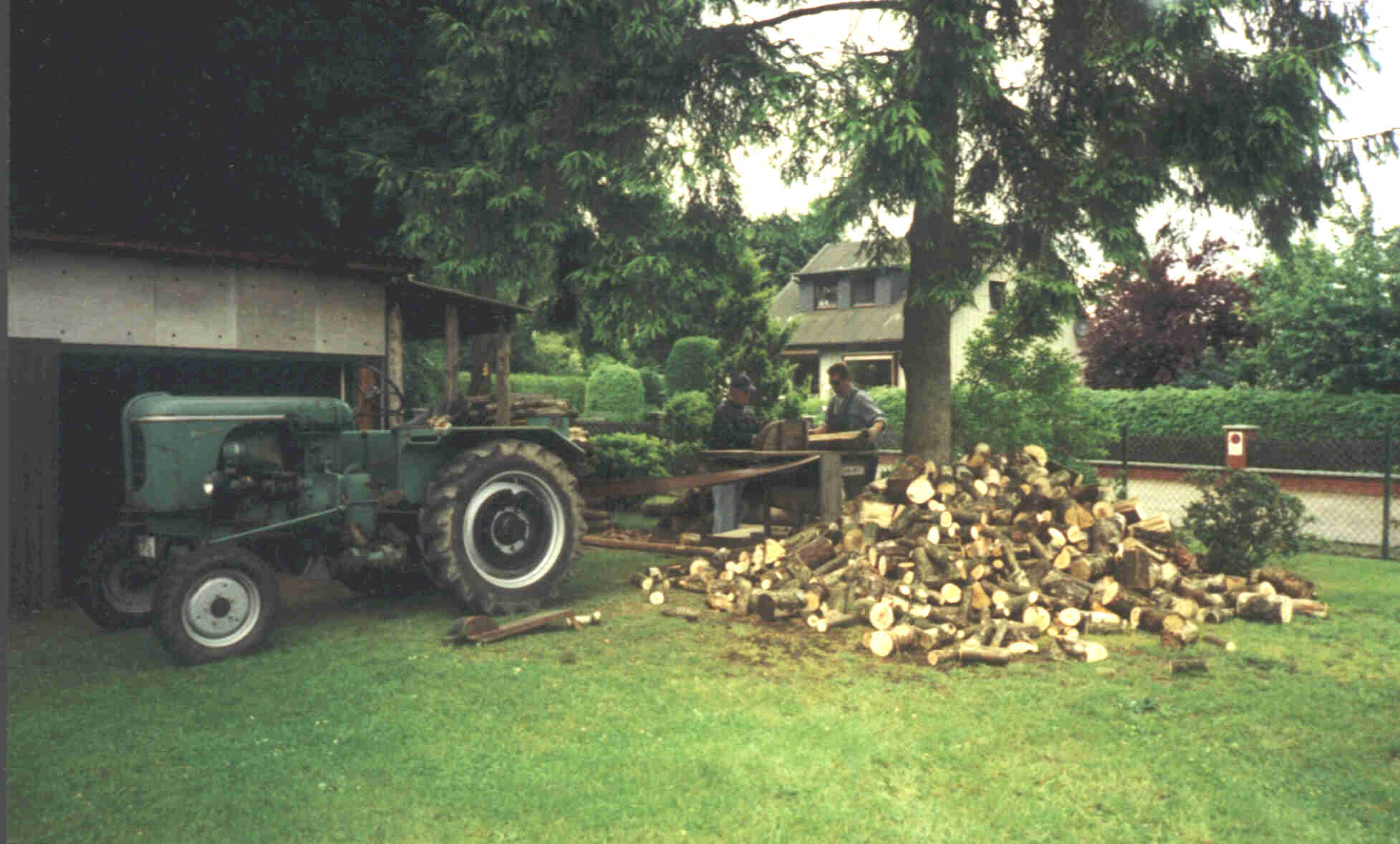 Nachdem das Holz aus dem Wald geholt worden ist, wird es mir eine Kreissäge (700 mm Blatt) zu handlichen Stücken verarbeitet. Die Kreissäge wird über einen Transmissionsriemen vom 524 L angetrieben.
